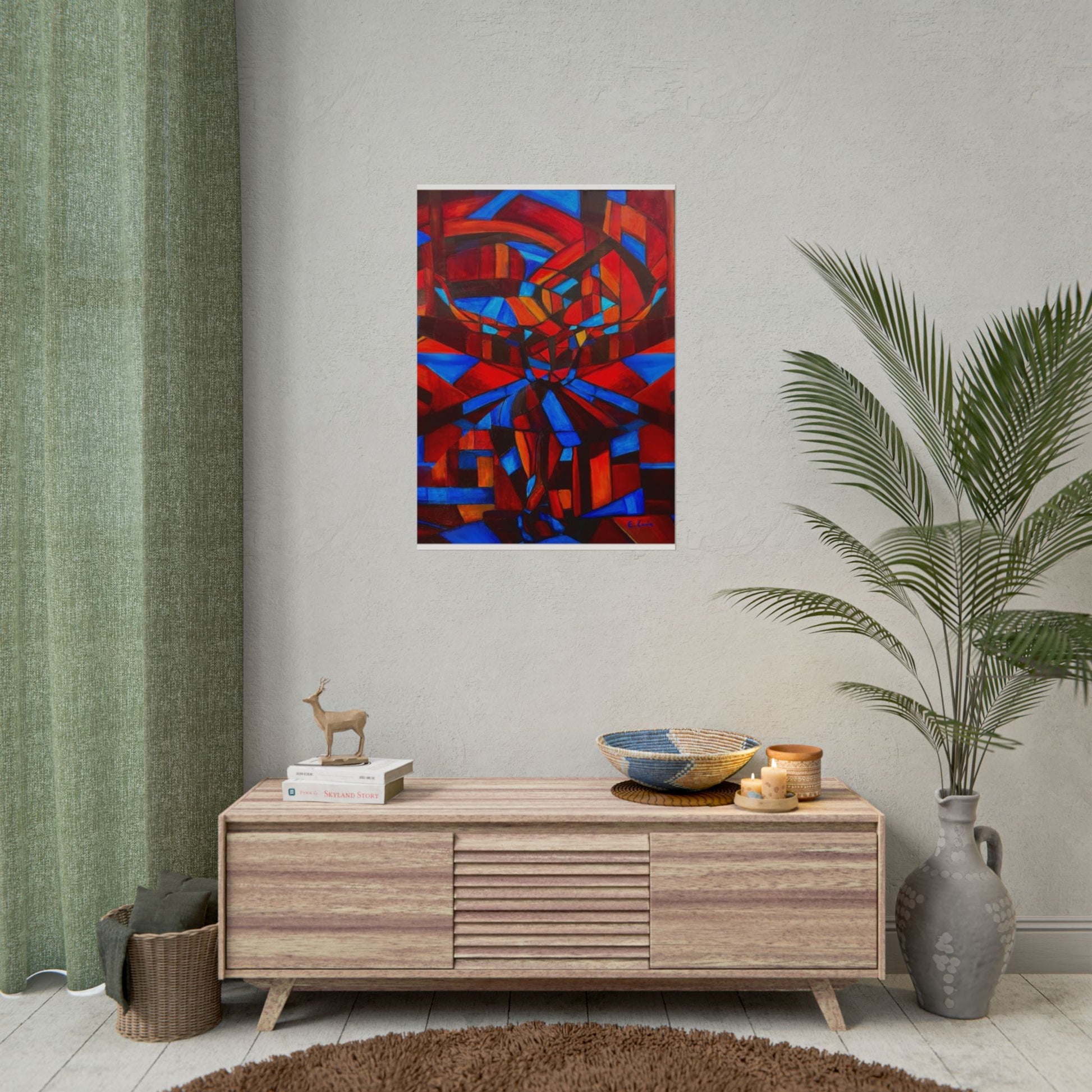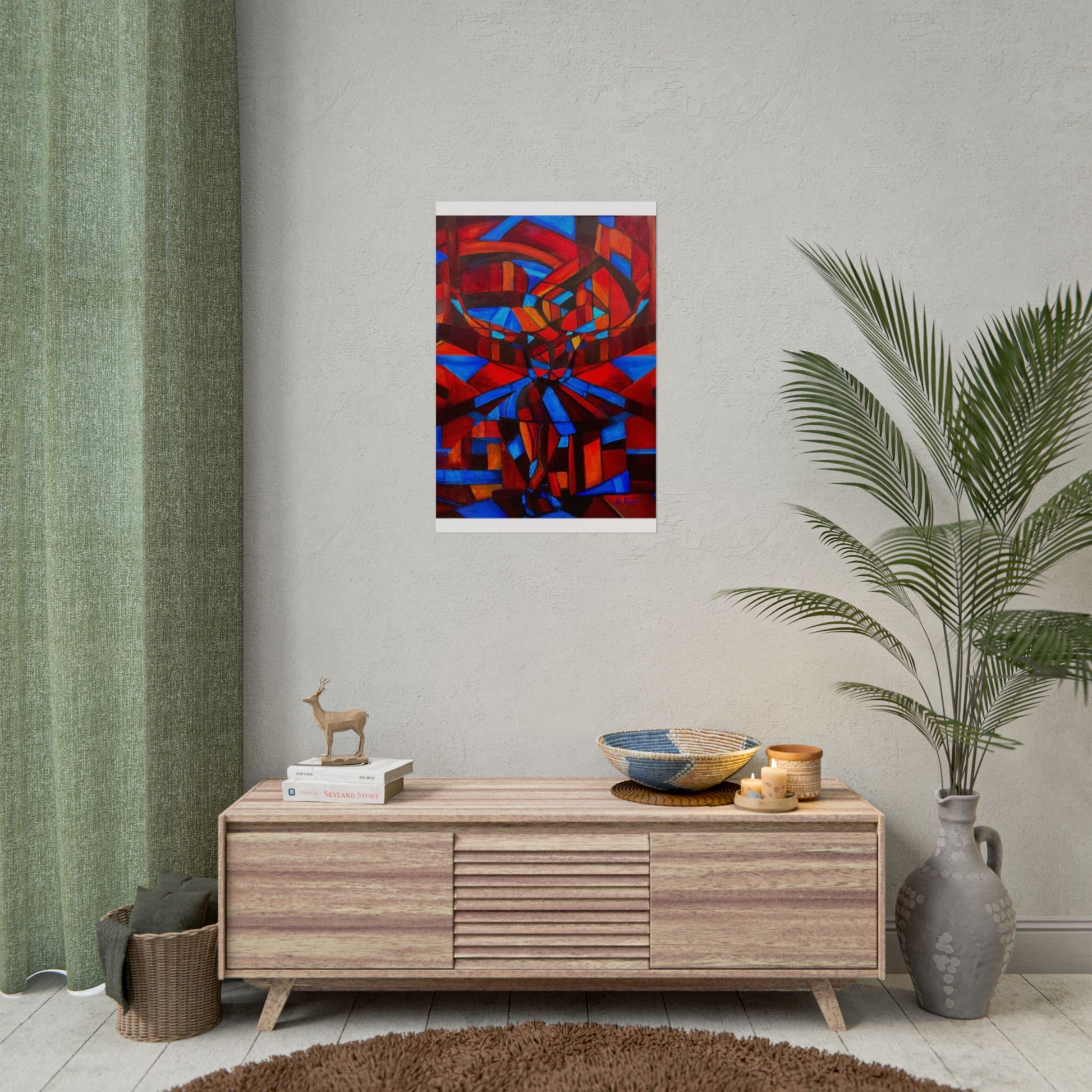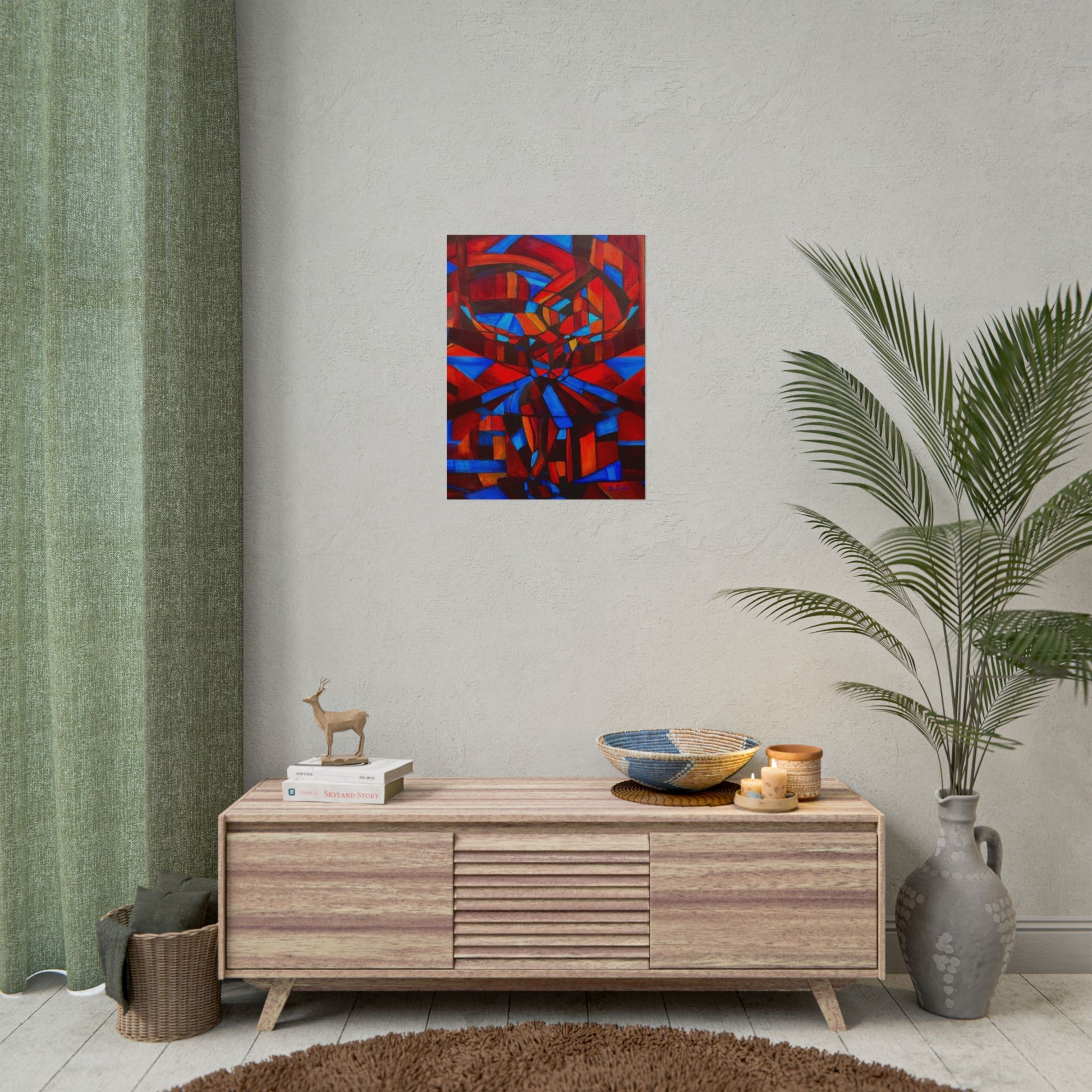This rolled poster brings bold geometry and saturated color into any room. Deep crimsons meet electric blues in an abstract composition that reads like stained glass—structured yet alive with motion. Printed on archival, gallery-grade papers with giclée inks, the image keeps its clarity and intensity over time. Hang it in a studio, beside a record shelf, or lean it against a mid-century credenza to add a crafted, contemplative edge to your space. The result feels curated and personal: a tactile, artful statement that ages gracefully and rewards close viewing.