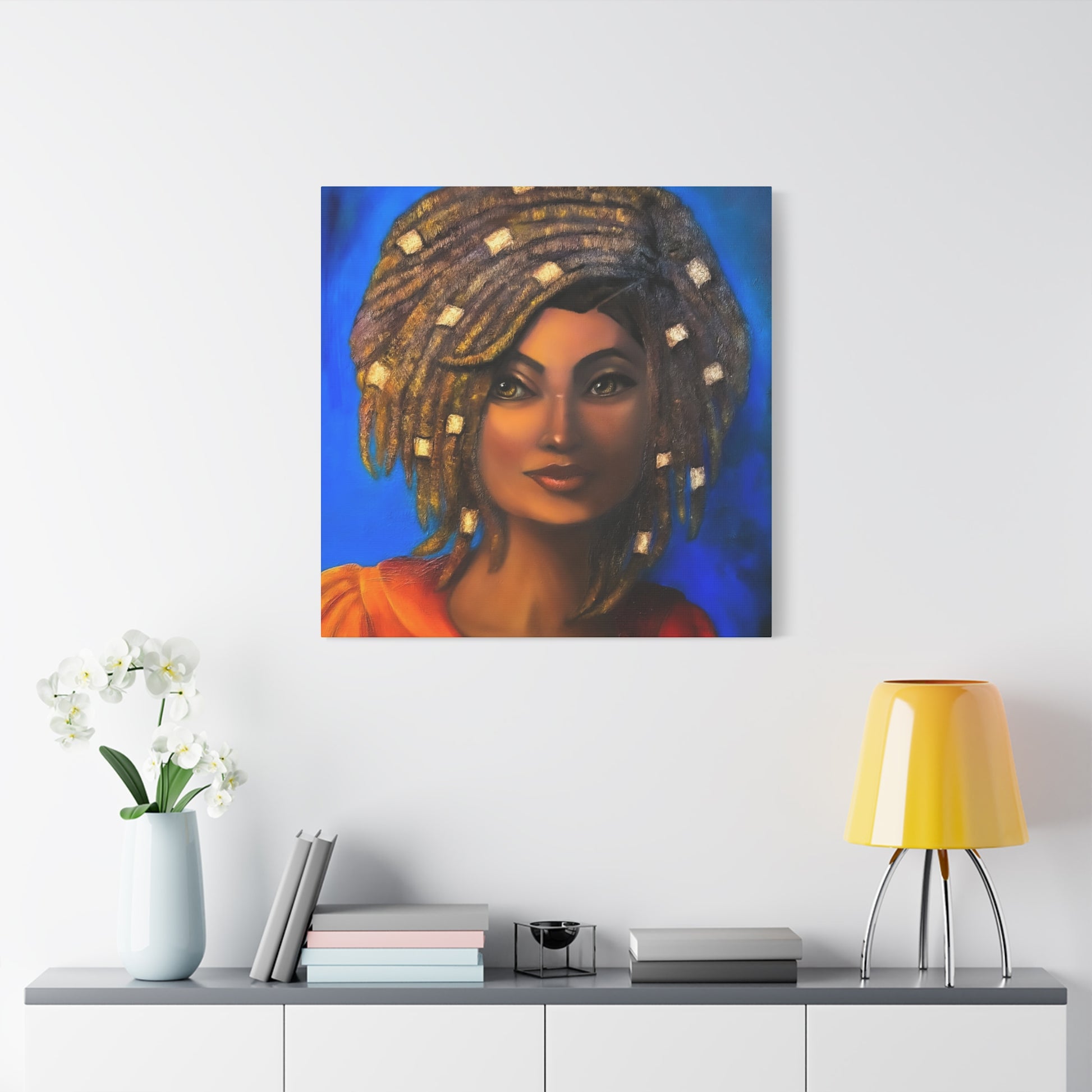 Hand-stretched matte canvas featuring a rich, painterly portrait that brings warmth and presence to any room. The deep cobalt background makes the figure’s textured locs and glowing skin pop, while the soft matte finish keeps reflections low and colors feeling intimate. Lightweight yet sturdy—this canvas arrives ready to hang and adds soulful, art-gallery energy to living rooms, studios, or cozy reading nooks. It’s made with non-toxic latex inks and sustainably sourced pine, so the artwork looks beautiful and feels responsible.