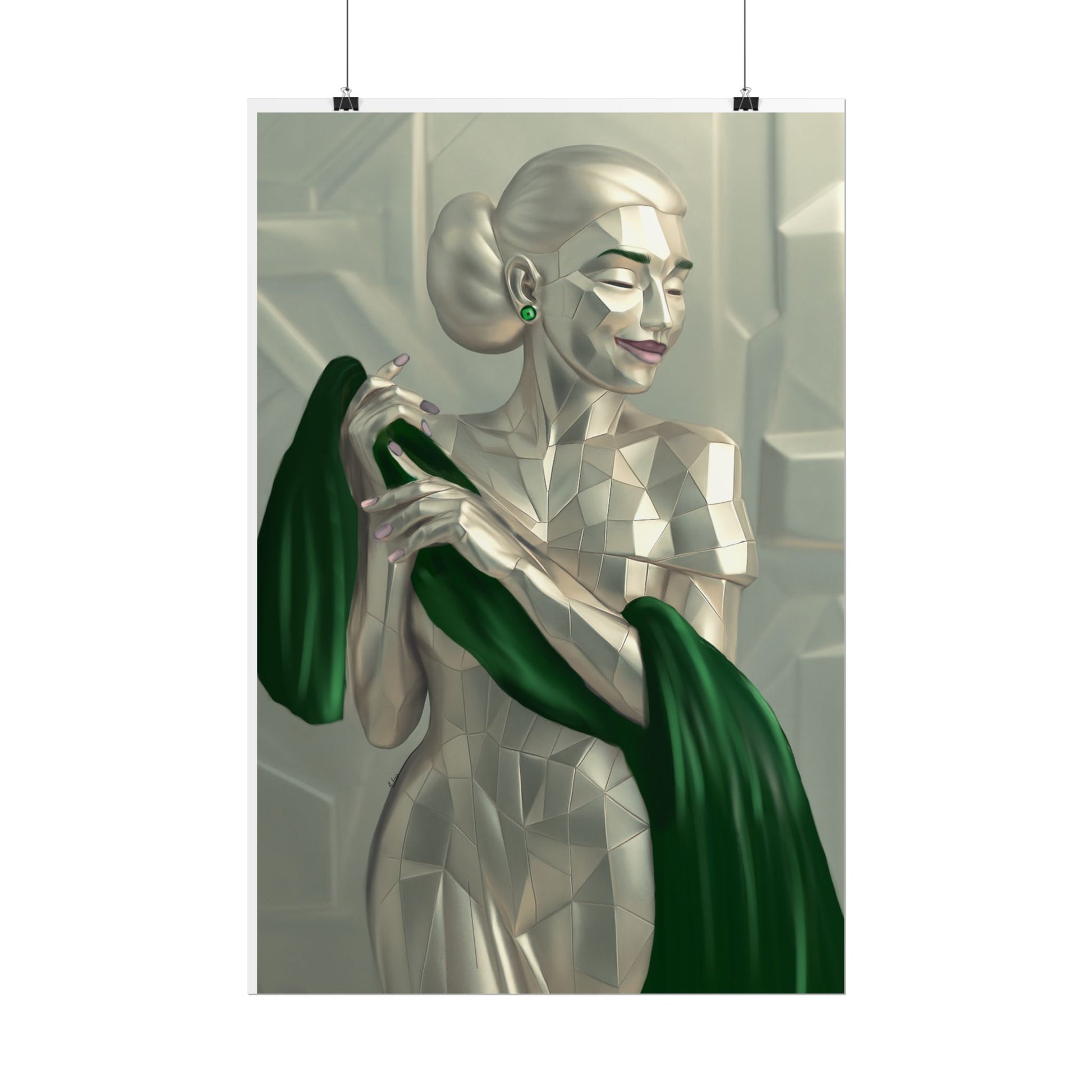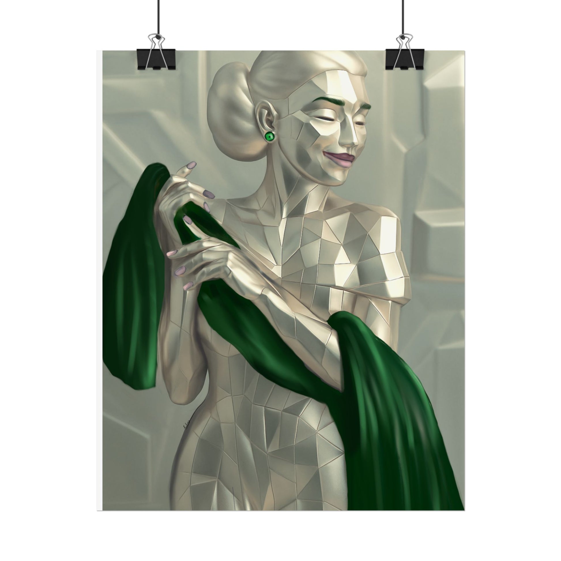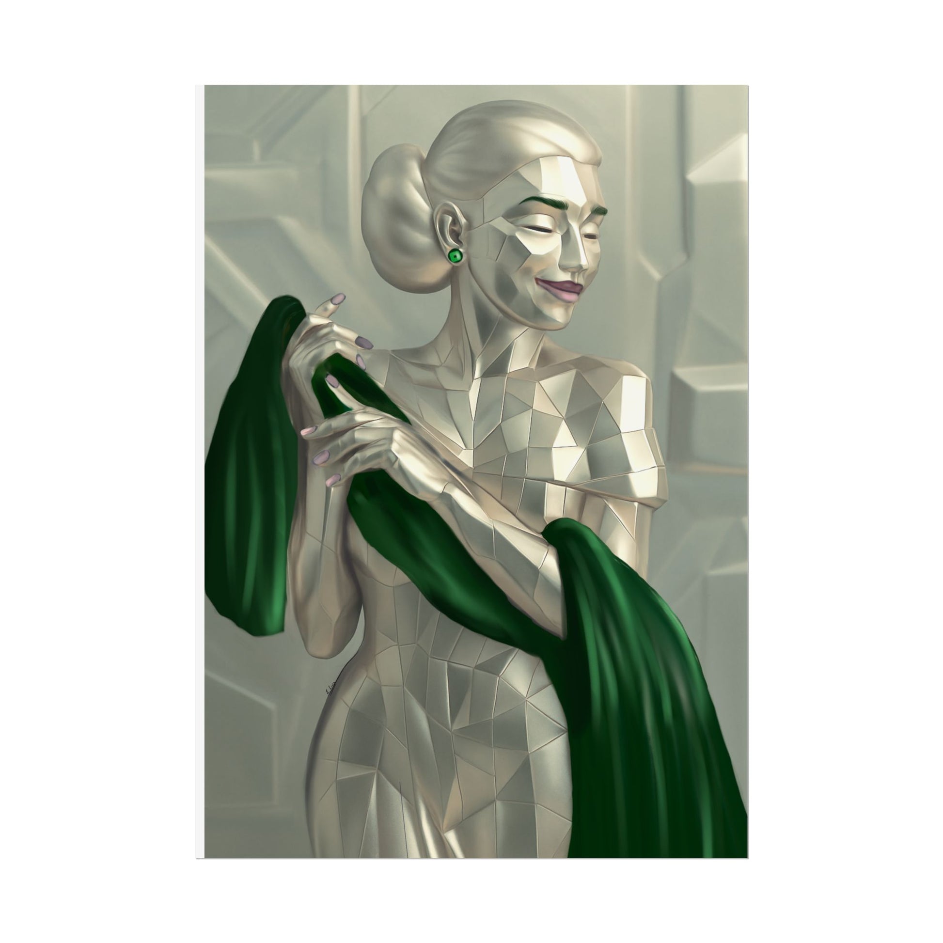A rolled art poster that brings a cool, sculpted elegance to your walls. The print shows a faceted, statue-like figure rendered in luminous tones, draped with a deep emerald fabric that feels both luxurious and mysterious. Choose from textured fine art, satin semi-gloss, or understated matte papers to match your space — each option holds bright, giclée color that resists regular sunlight fading. Hung in a studio, hallway, or living room, this piece reads like modern sculpture on paper: tactile, refined, and quietly theatrical. It pairs especially well with minimalist frames, clipped poster displays, or gallery-style groupings, and the range of sizes and orientations makes it easy to place where it will catch the eye.