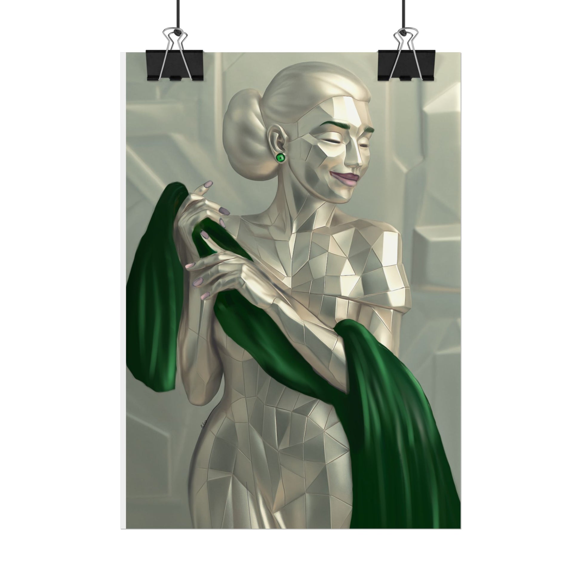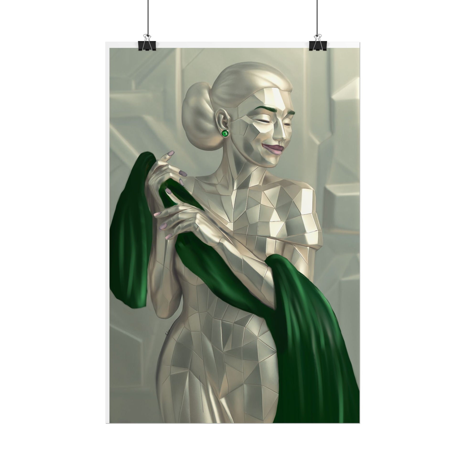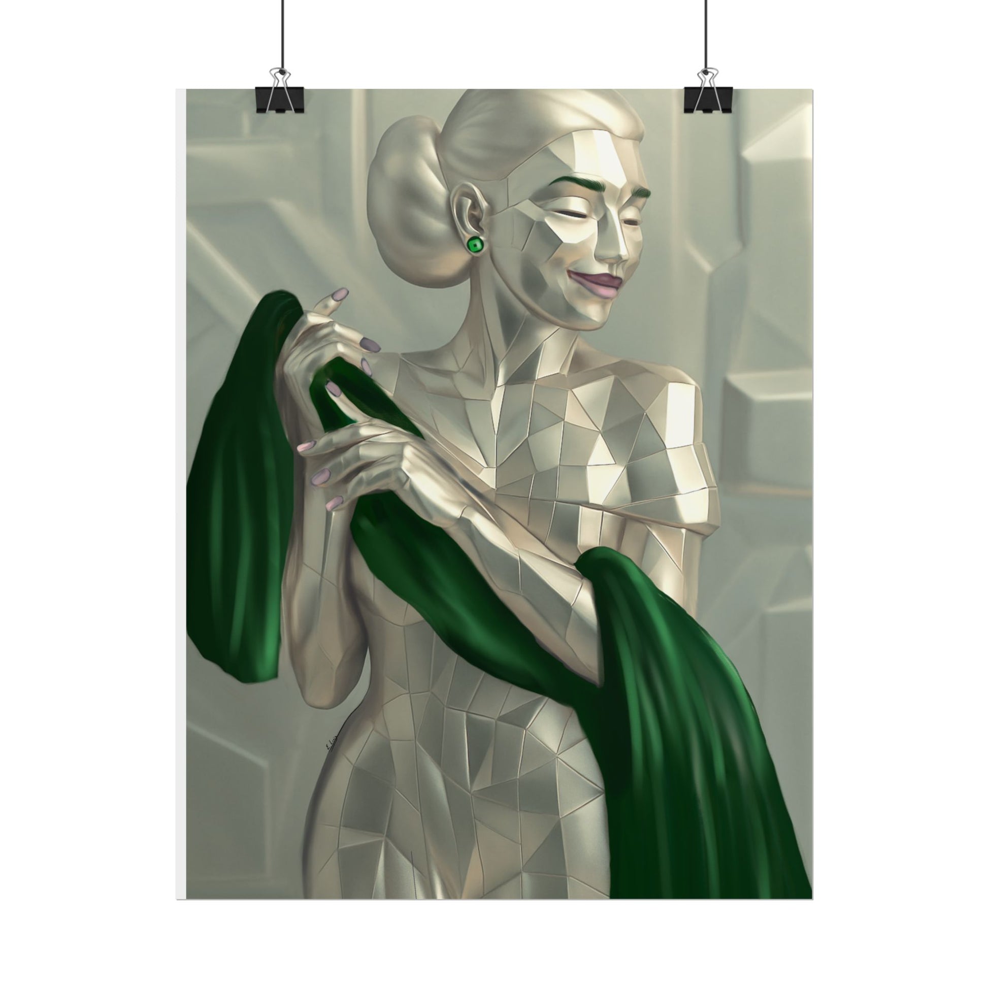A rolled art poster that brings a cool, sculpted elegance to your walls. The print shows a faceted, statue-like figure rendered in luminous tones, draped with a deep emerald fabric that feels both luxurious and mysterious. Choose from textured fine art, satin semi-gloss, or understated matte papers to match your space — each option holds bright, giclée color that resists regular sunlight fading. Hung in a studio, hallway, or living room, this piece reads like modern sculpture on paper: tactile, refined, and quietly theatrical. It pairs especially well with minimalist frames, clipped poster displays, or gallery-style groupings, and the range of sizes and orientations makes it easy to place where it will catch the eye.