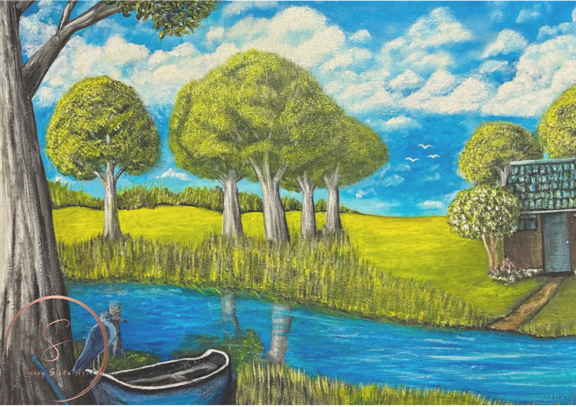 Cabin by the River invites you into a peaceful countryside retreat where nature and serenity meet. A quiet cabin rests among vibrant green fields, framed by tall trees and a brilliant sky, while a calm river flows gently in the foreground. A lone boat and a watchful bird complete the scene, reminding us of still moments by the water’s edge.