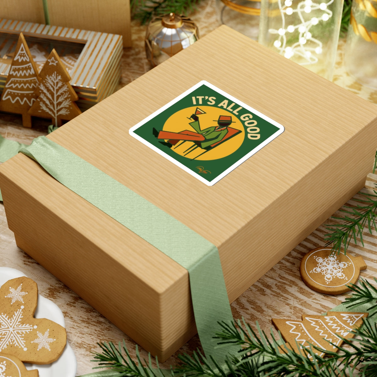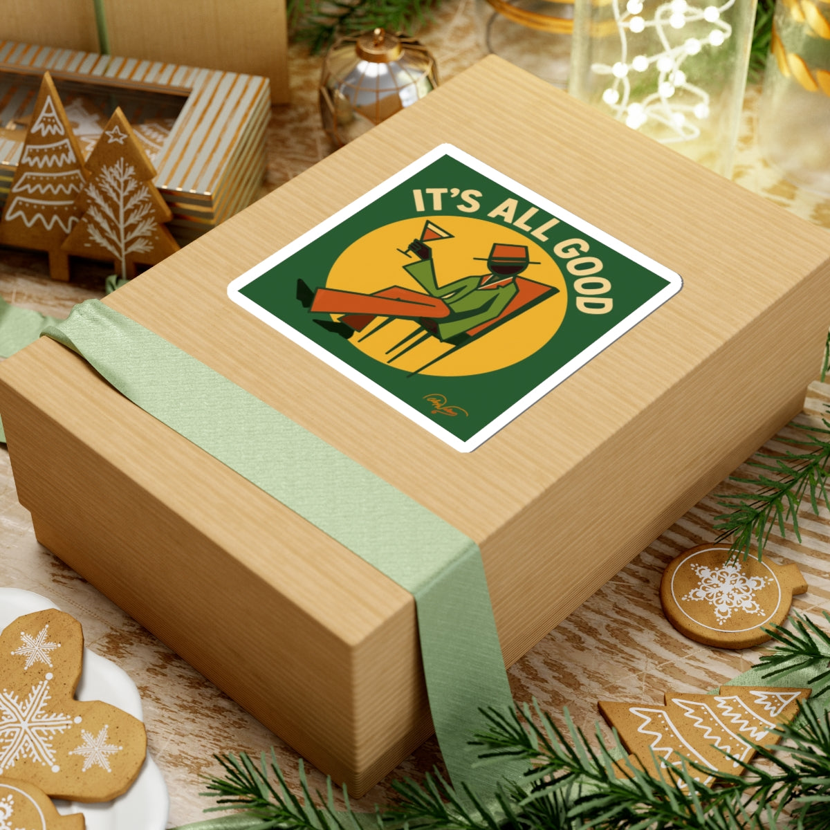 A glossy kiss-cut sticker that brings laid-back jazz-club vibes to your everyday gear. The retro illustration—an easygoing figure reclining with a cocktail under the phrase "IT'S ALL GOOD"—lands in warm ochres and deep greens for a vintage, mellow look. Designed for smooth application on laptops, journals, windows, and more, these vinyl stickers add personality without fuss. They’re bright, scratch-resistant, and made to stick around on indoor surfaces where you want a little calm confidence and character showing.