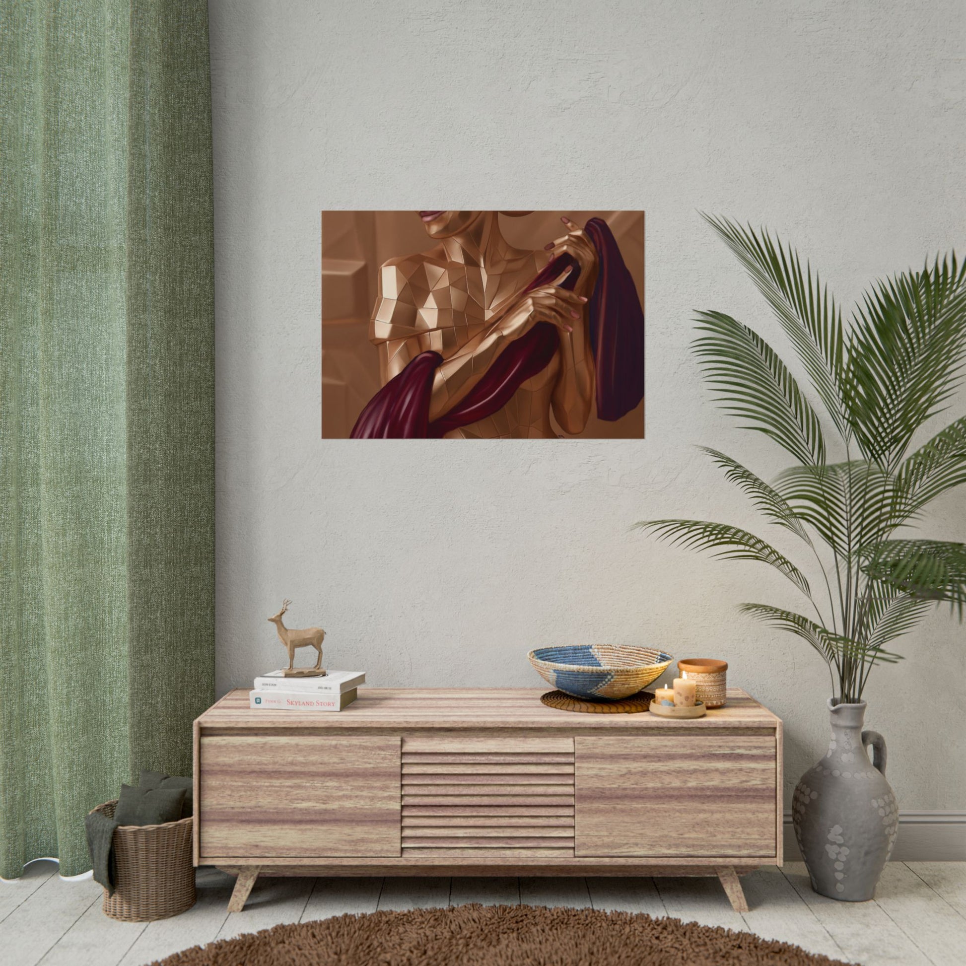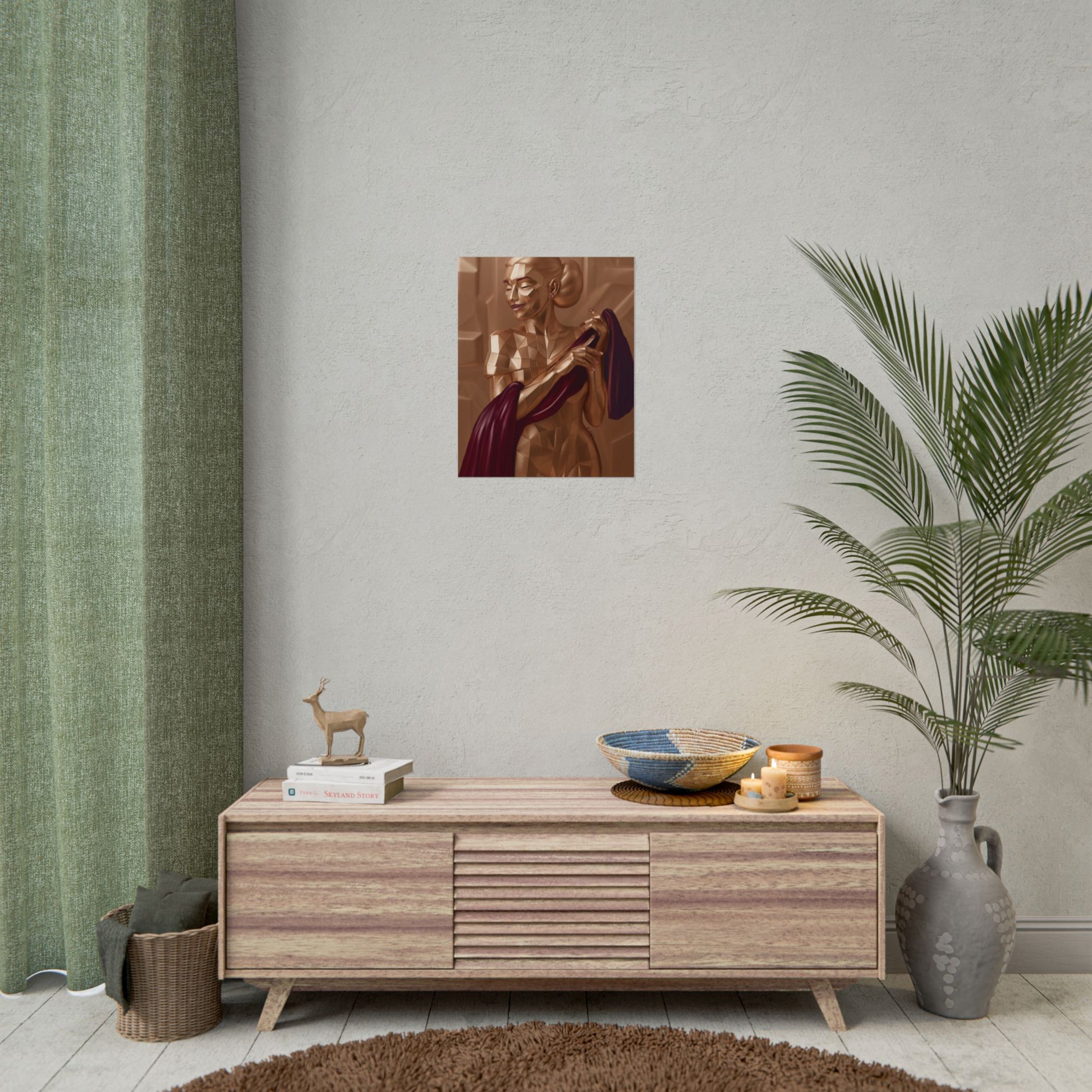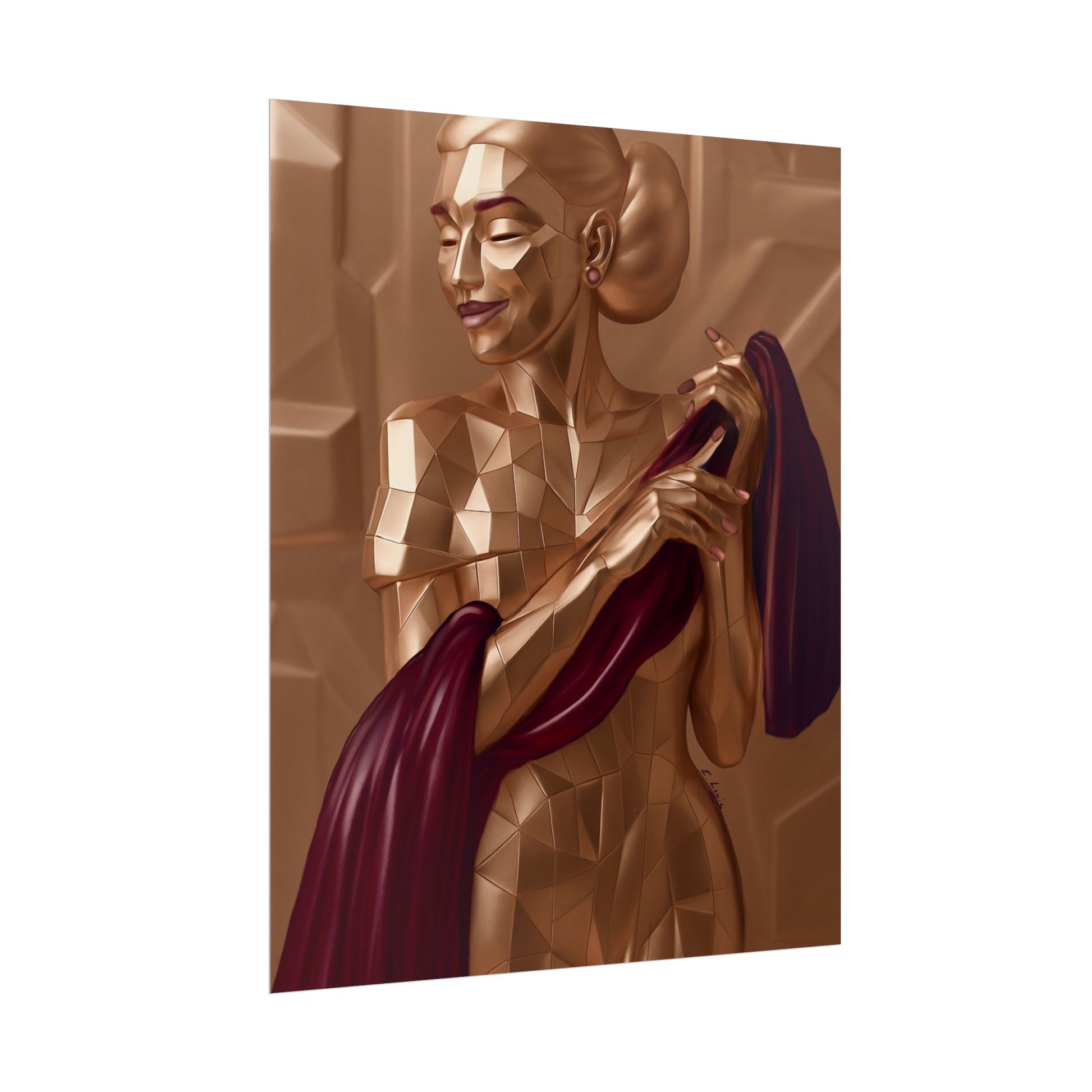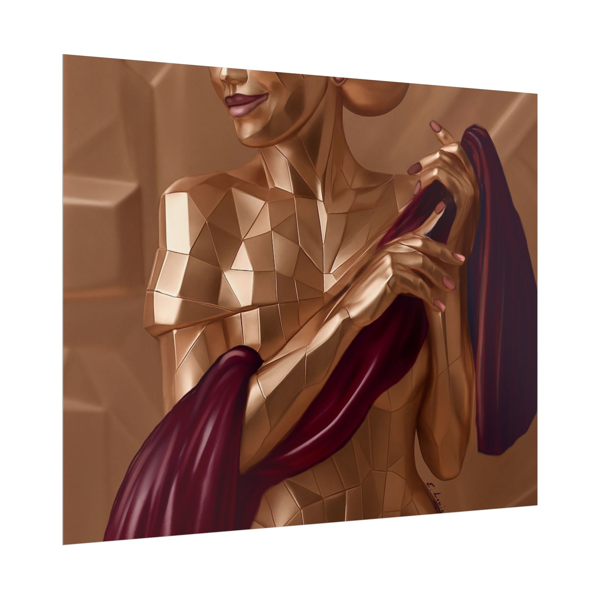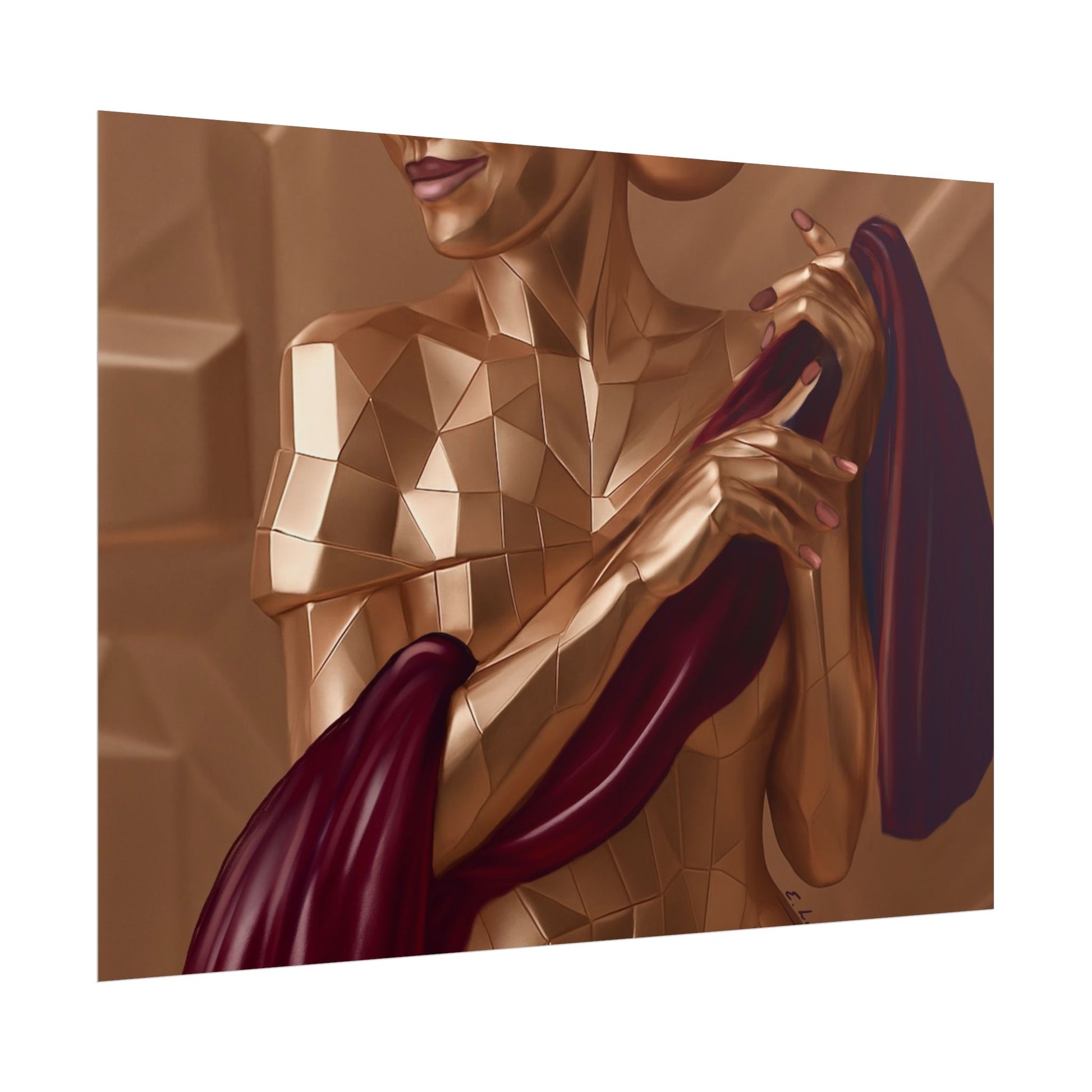 This rolled poster captures a sculptural, faceted figure rendered in warm bronze tones, draped with a deep burgundy cloth that adds softness and drama. The artwork feels both modern and classical — like a contemporary statue caught mid-motion. Printed with high-fidelity giclée inks, the piece keeps rich, luminous color and fine detail whether you choose the textured fine art paper, the satin-like semi-gloss, or the understated matte finish. Hang it in a living room, studio, or hallway to introduce a cinematic, gallery-ready mood that invites closer looks and quiet conversation.