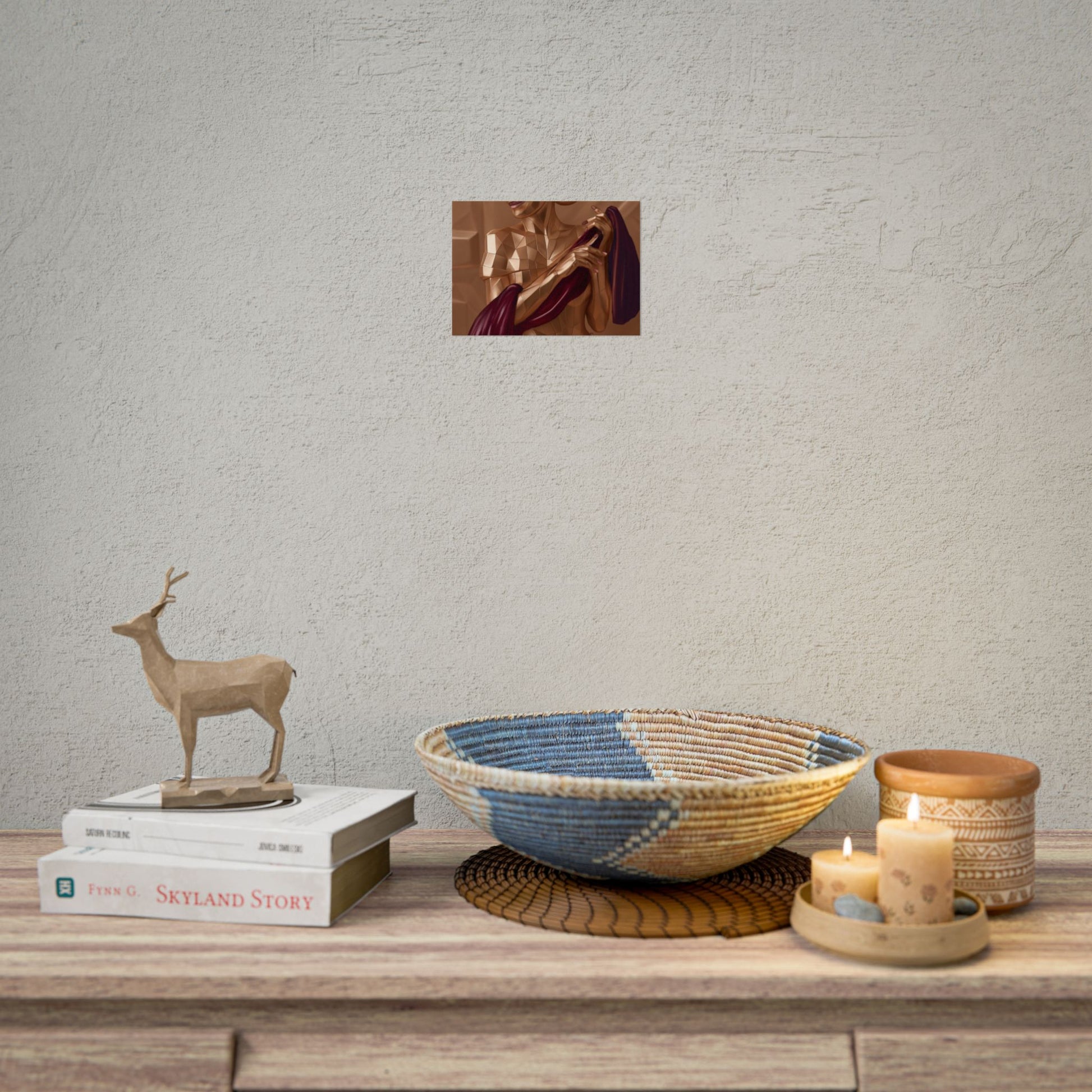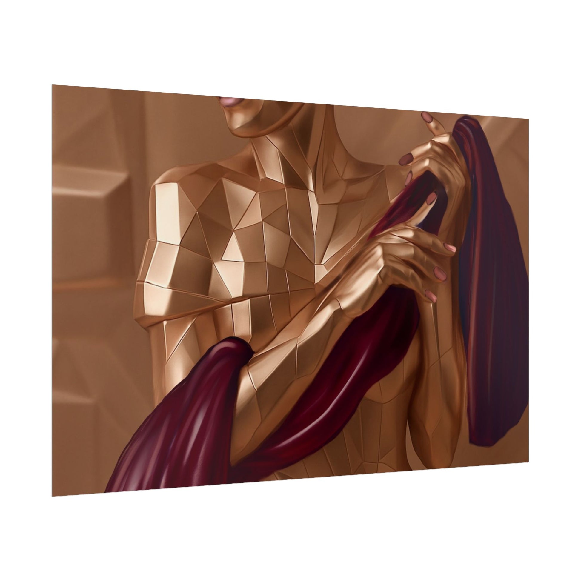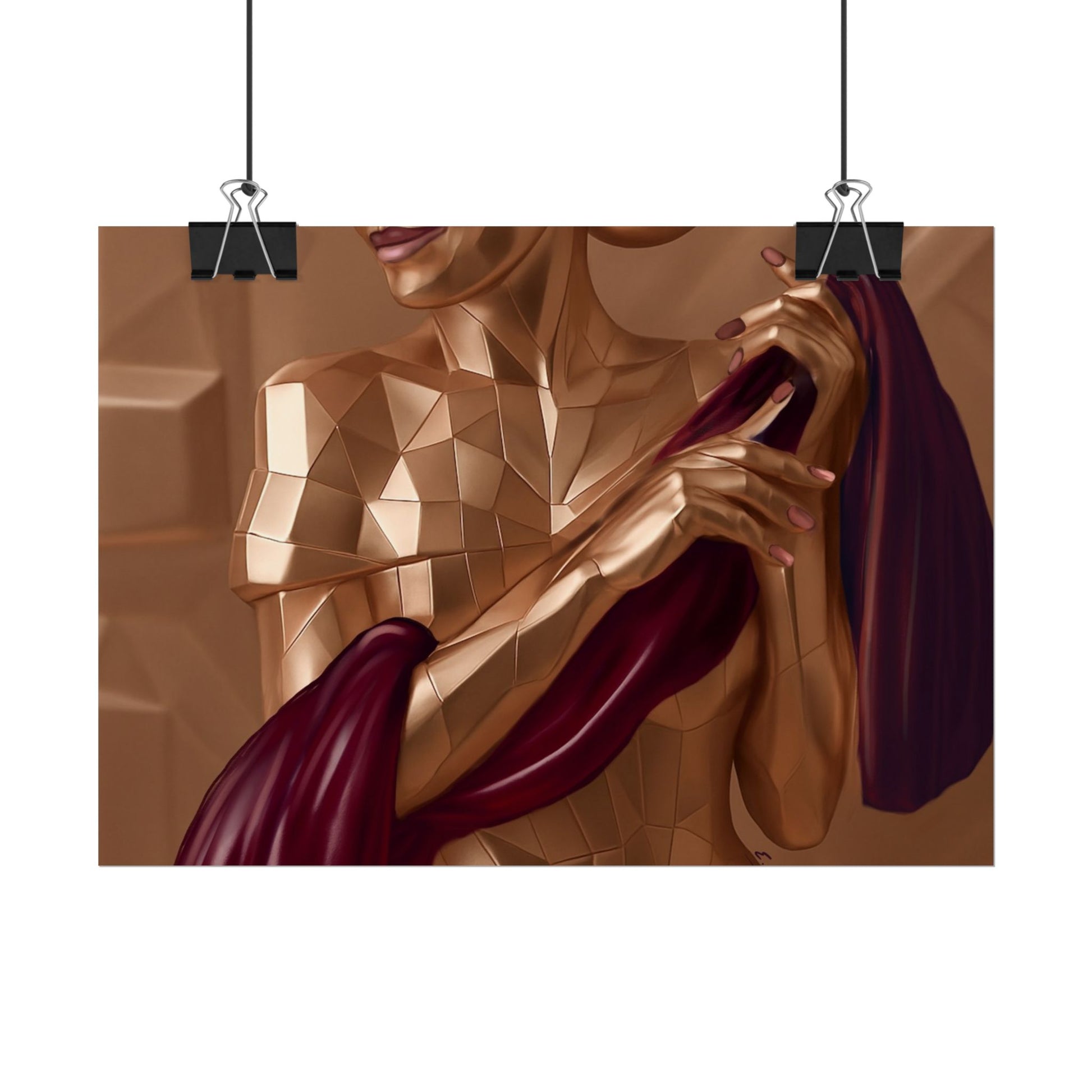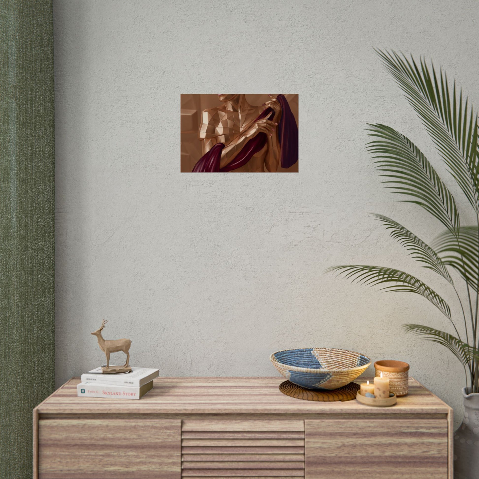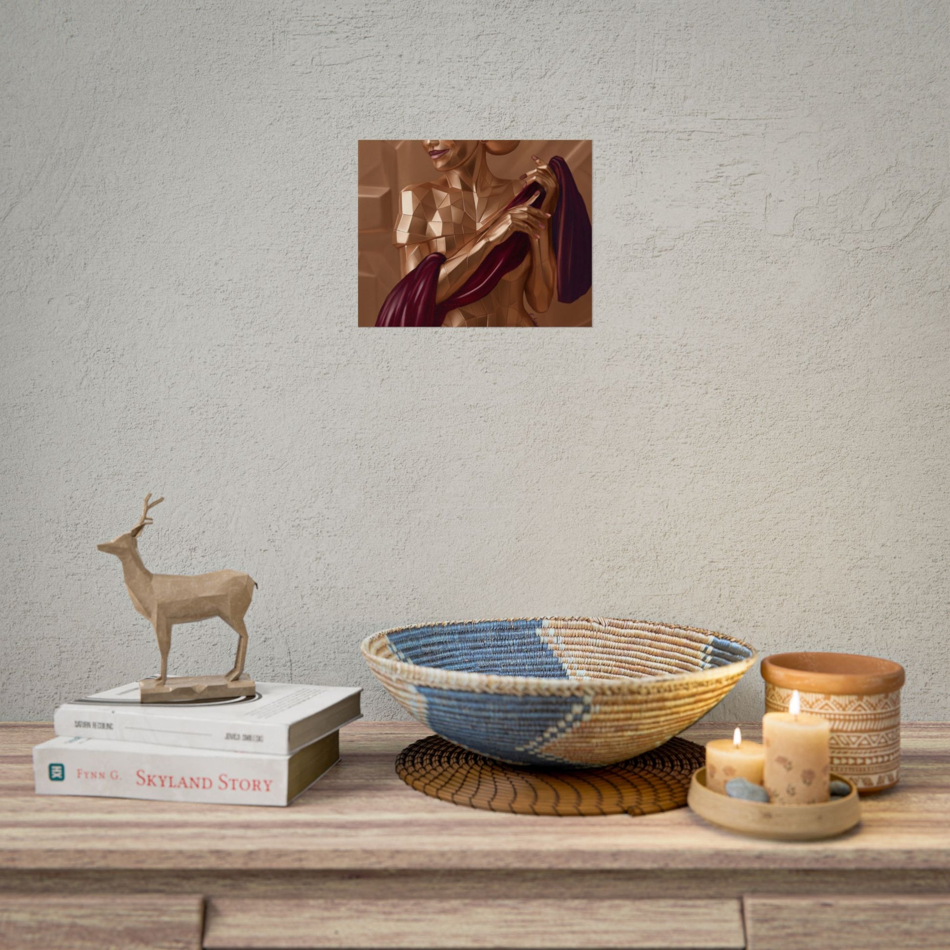 This rolled poster captures a sculptural, faceted figure rendered in warm bronze tones, draped with a deep burgundy cloth that adds softness and drama. The artwork feels both modern and classical — like a contemporary statue caught mid-motion. Printed with high-fidelity giclée inks, the piece keeps rich, luminous color and fine detail whether you choose the textured fine art paper, the satin-like semi-gloss, or the understated matte finish. Hang it in a living room, studio, or hallway to introduce a cinematic, gallery-ready mood that invites closer looks and quiet conversation.