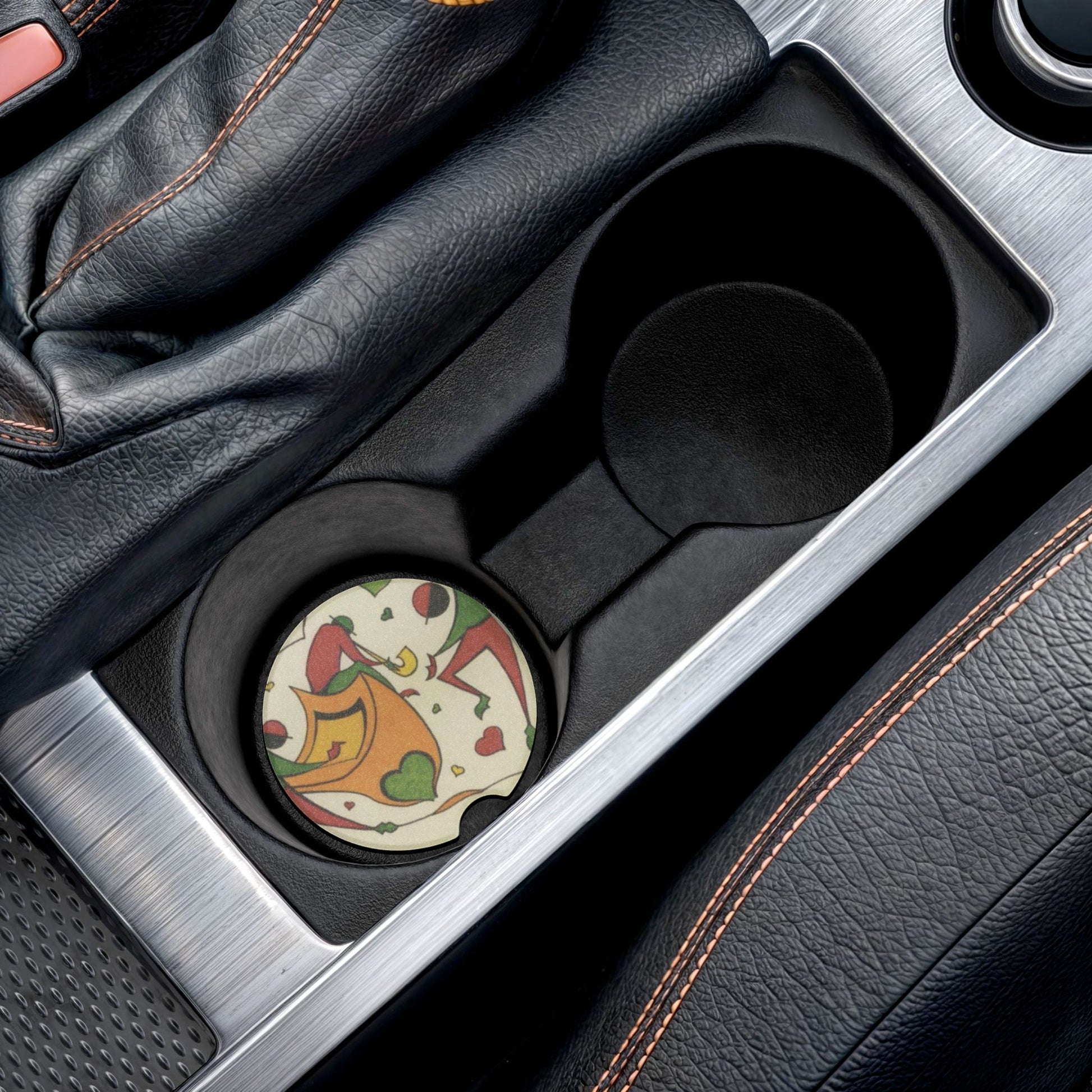 Hand-carved feel, modern convenience. These soapstone car coasters bring a warm, playful charm to your cup holder — soft matte art printed on absorbent soapstone that quietly soaks up condensation and keeps your vehicle tidy. The design features a stylized heart-and-jester motif in warm oranges, greens and creams, giving a cheerful, slightly retro vibe that peeks around your travel mug or bottle. Lightweight and snug, each coaster has a small notch for easy removal and a removable sticker on the back. Choose a single piece for a subtle accent or a set of 2 or 4 when you want matching art across every holder.
